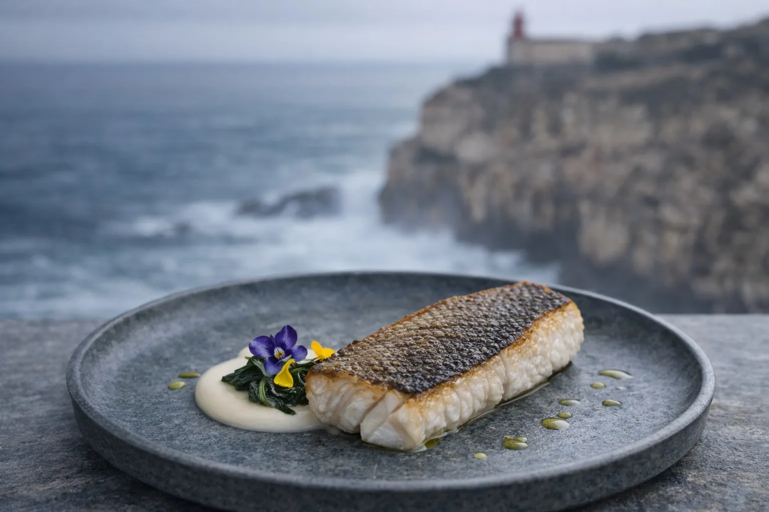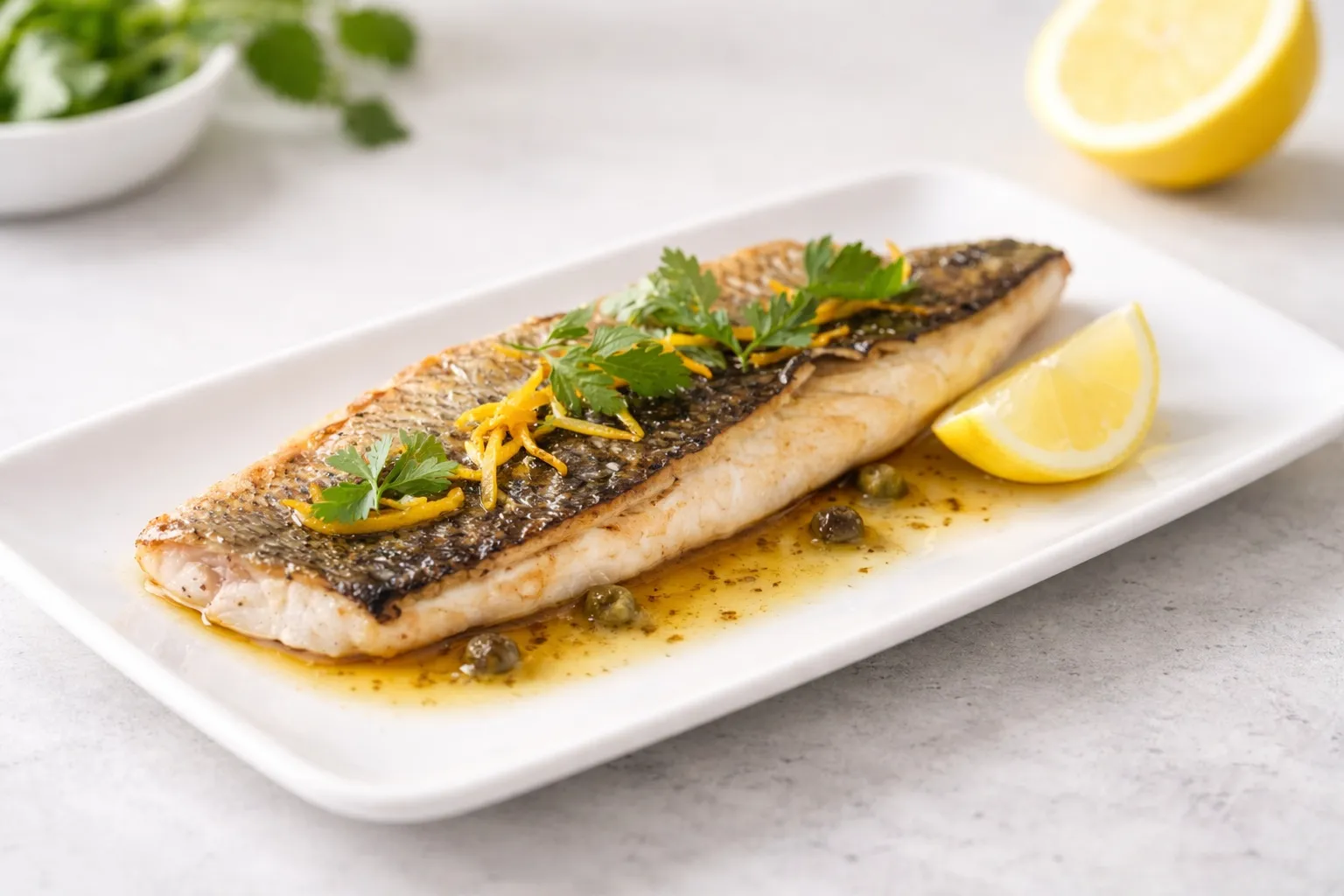 Sar poêlé façon meunière beurre noisette et citron, filet saisi côté peau jusqu’à obtenir une peau croustillante, puis arrosé d’un beurre noisette et d’un trait de citron pour révéler la fermeté et le goût iodé de la chair.