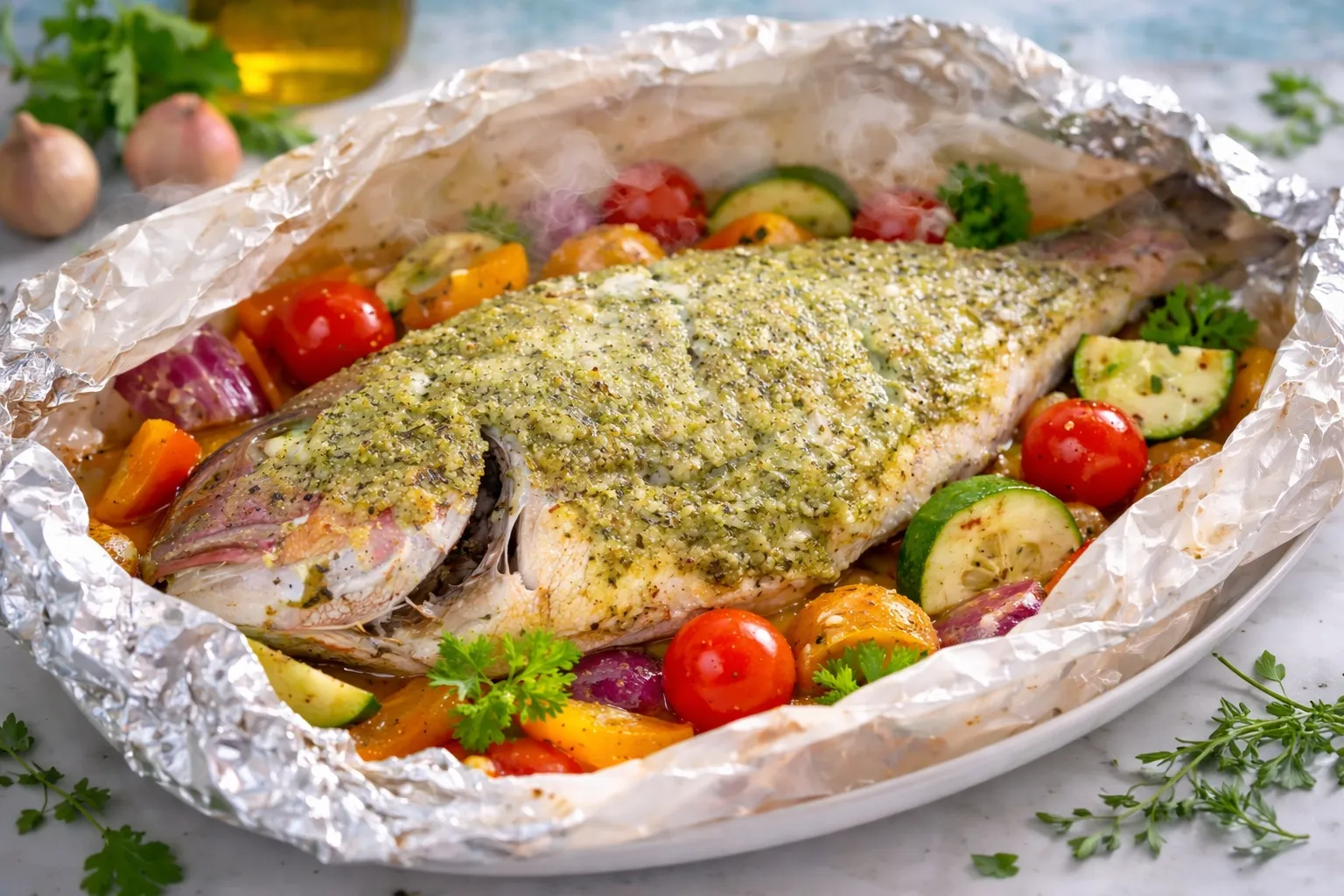 Sar en papillote fenouil et herbes fraîches, cuit doucement à l’étouffée avec fenouil, herbes et zestes d’agrumes, une cuisson délicate qui préserve l’iodé et la texture naturelle.