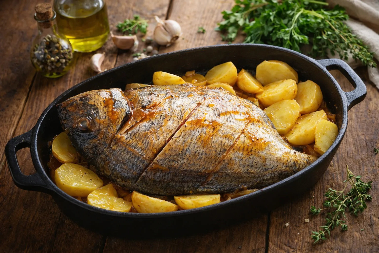 Sar rôti entier au four huile d’olive ail et thym, cuit sur l’os à température modérée, arrosé d’huile d’olive, avec ail écrasé et thym frais, la peau devient légèrement croustillante et protège une chair ferme et juteuse.