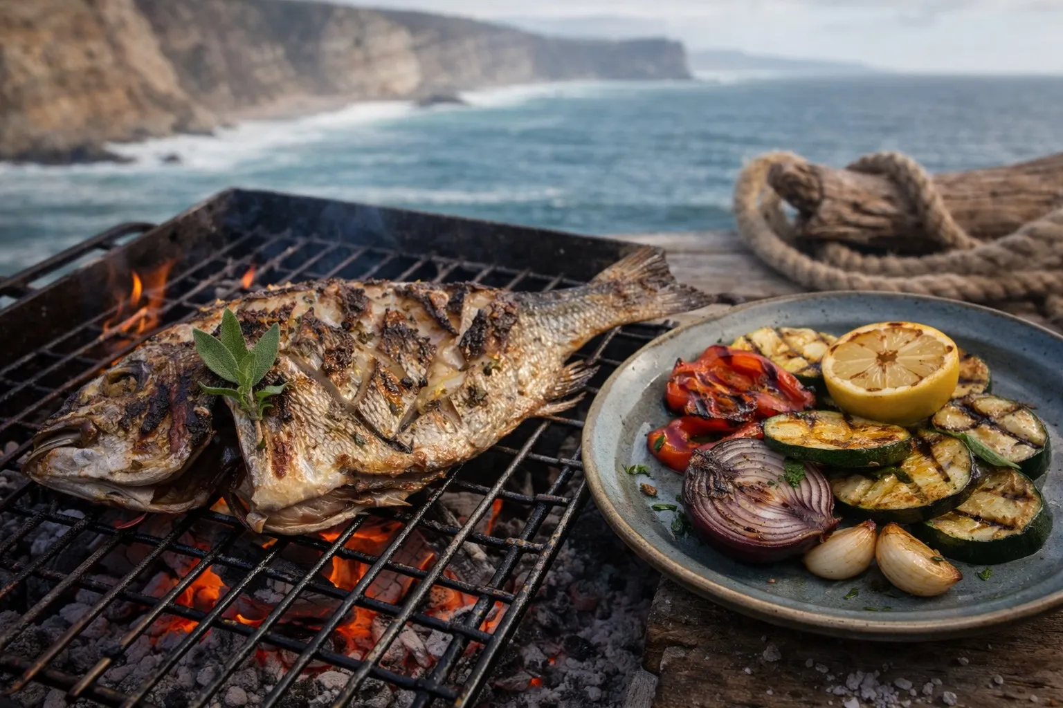 Sar au barbecue herbes fraîches et huile d’olive, grillé entier ou en portefeuille sur la braise, badigeonné d’huile d’olive et d’herbes fraîches, une cuisson franche et méditerranéenne.