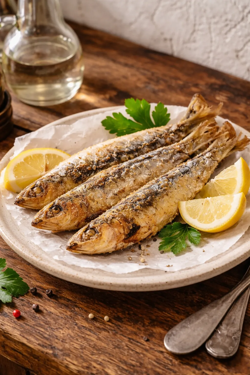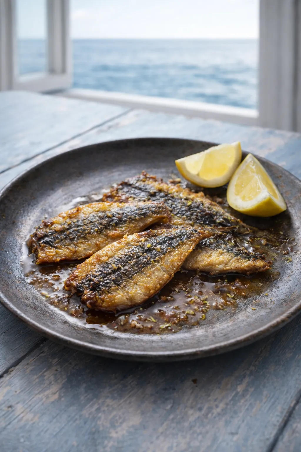 Filets de sardines poêlés au beurre citronné : Saisis côté peau, arrosés de beurre noisette, citron frais et persil.