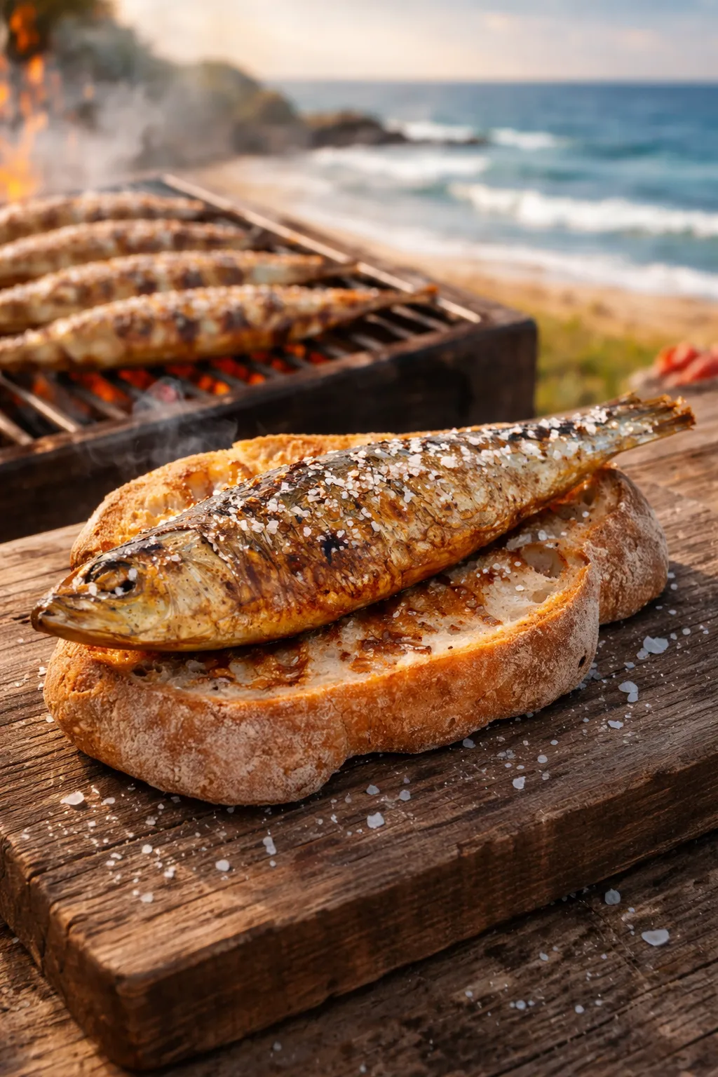 Sardinhada de Nazaré : Sardines entières salées au gros sel le matin, bien avant cuisson. Grillées sur braise vive. Servies sur une tranche de pain de campagne qui absorbe le jus. La base absolue.