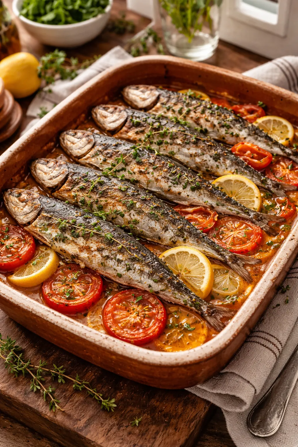 Sardines à la Provençale : Cuites au four sur un lit de tomates fraîches, olives noires et thym. Le jus devient sauce naturelle.