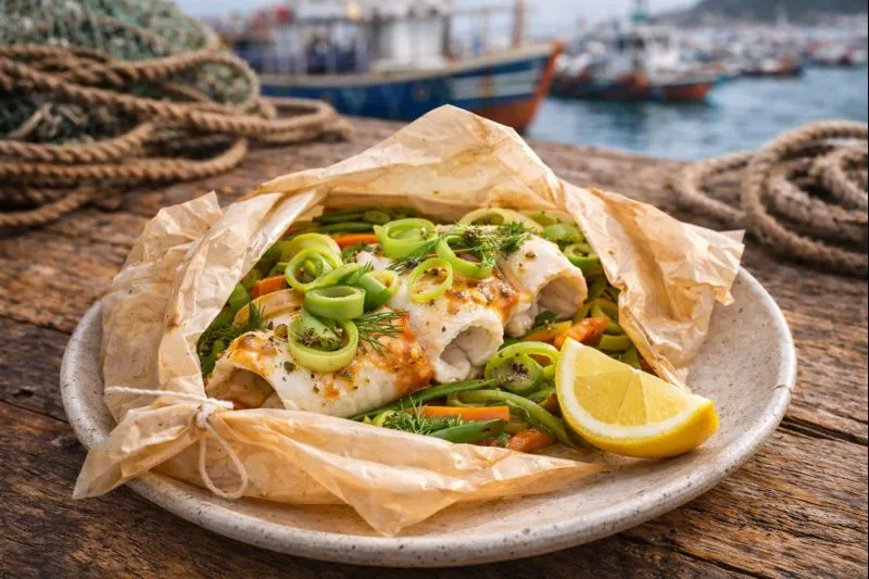 Sole en papillote aux herbes, cuisson fermée, thym et laurier, chair moelleuse, parfum délicat, zéro complication.