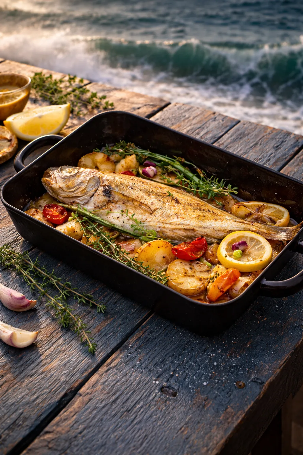 Tacaud entier au four à l’huile d’olive et ail : Cuit doucement, arrosé d’huile d’olive et d’ail frais. Chair fondante, saveur franche, cuisson familiale et efficace.