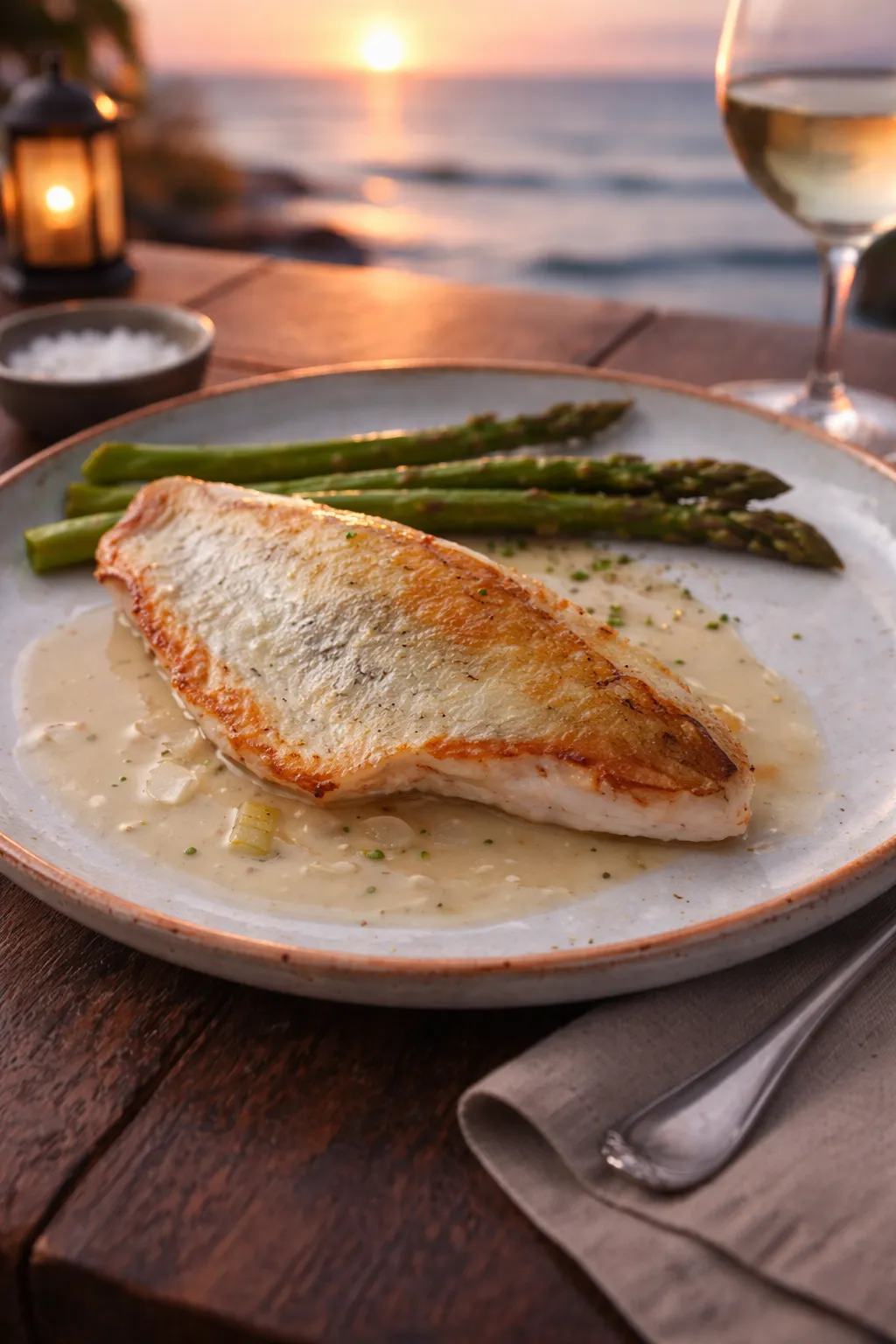 Tacaud gastronomique au beurre blanc léger : Filets nacrés, beurre blanc citronné peu monté. Une approche précise et raffinée qui sublime la délicatesse du tacaud.