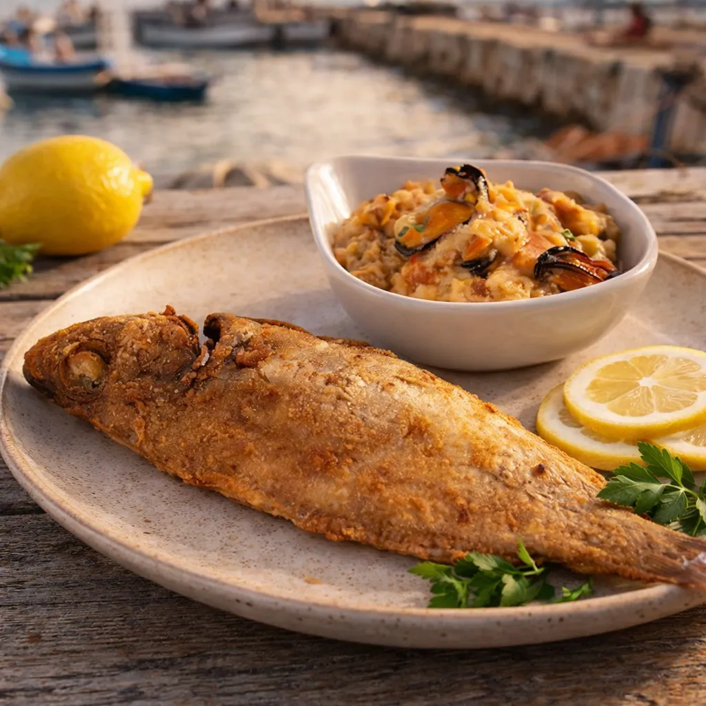 Tacaud frit croustillant à la portugaise : Légèrement fariné, frit rapidement, servi avec citron et persil. Croustillant à l’extérieur, chair fine et juteuse à cœur, un grand classique populaire et intemporel.