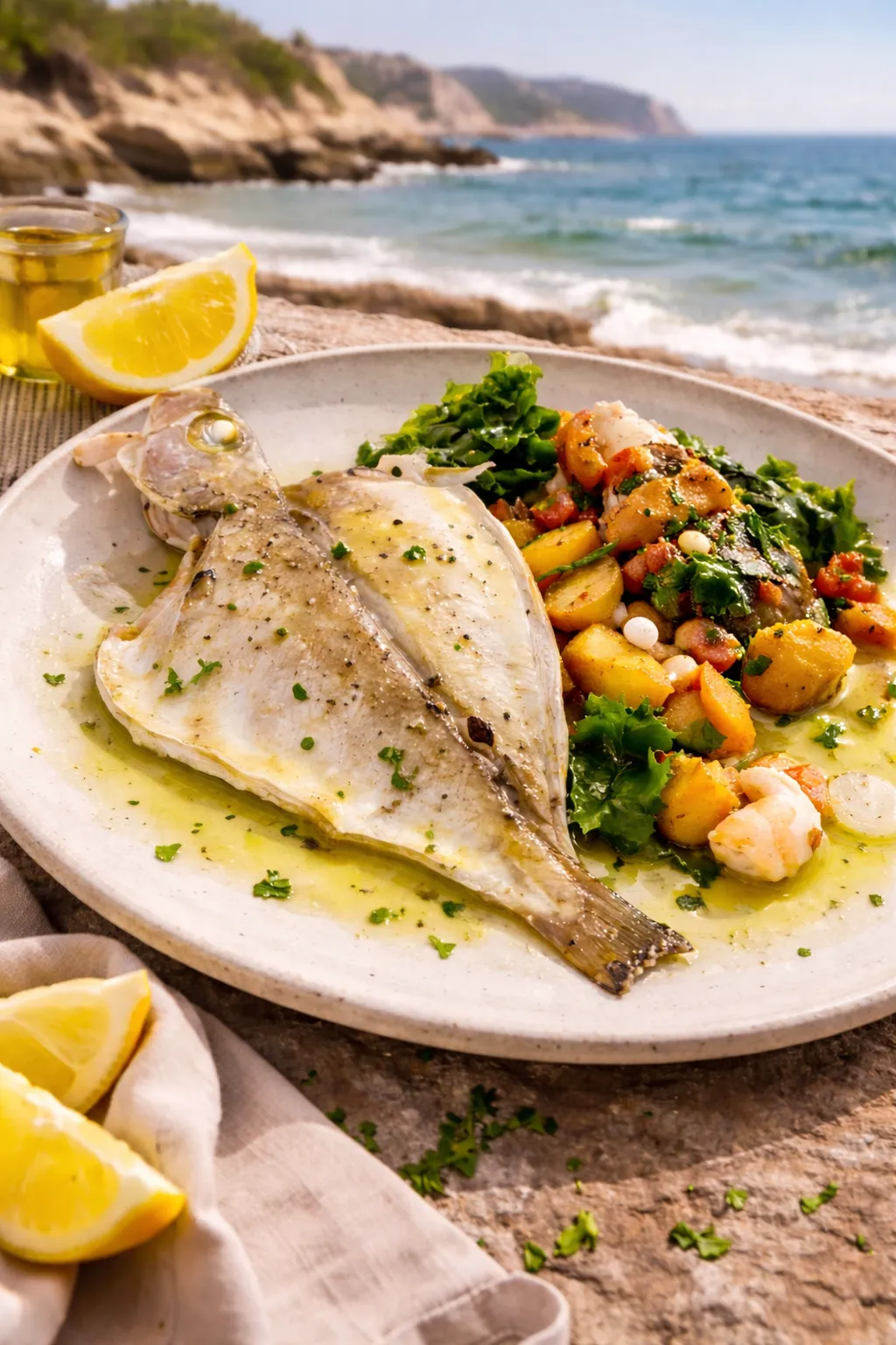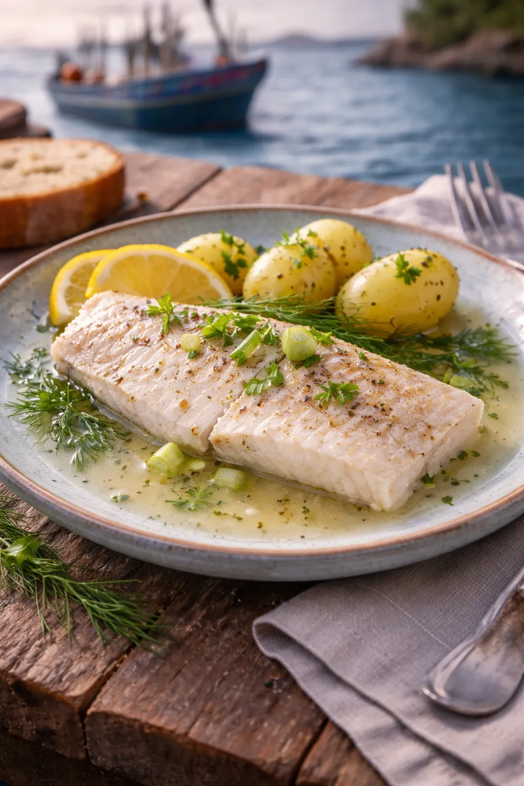 Tacaud à la portugaise ail, coriandre et citron : Poêlé simplement, ail doré, coriandre fraîche et jus de citron. Une recette emblématique de Nazaré, fraîche et expressive.